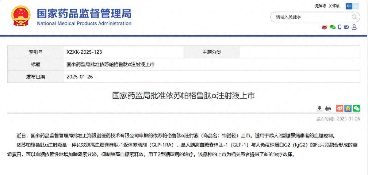 据人民日报健康客户端记者了解,依苏帕格鲁肽α于1月26日获批上市,是亚洲首个自研人源超长效GLP-1RA药物,用于单药治疗在饮食和运动干预后血糖控制不佳的2型糖尿病以及联合治疗二甲双胍治疗后血糖控制不佳的2型糖尿病。该国产新药上市后,或将成为更多2型糖尿病患者降糖减重的新选择。